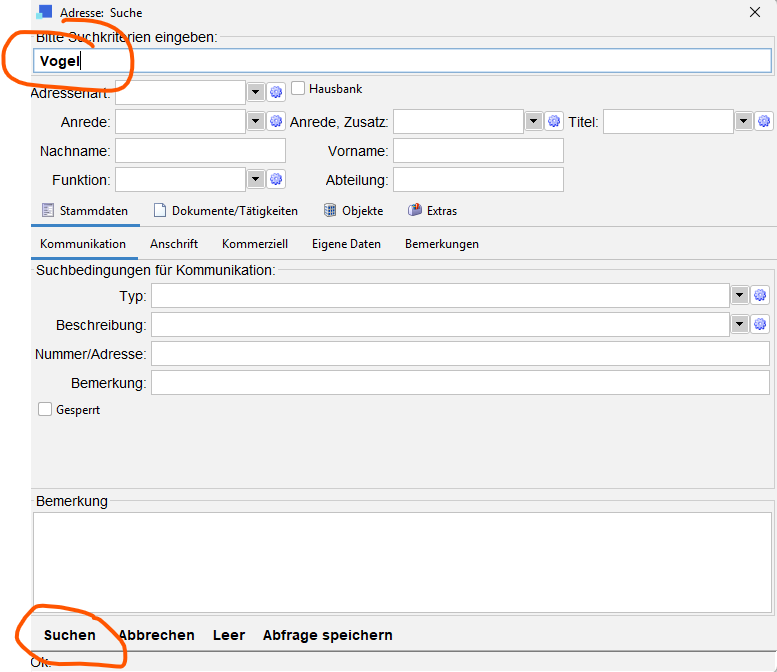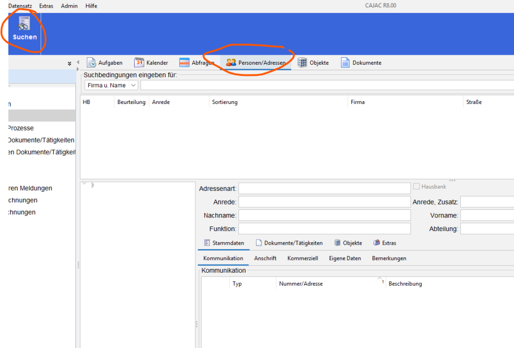 Suchen der Adresse z.B. über den Tabreiter ‚Personen/Adressen‘