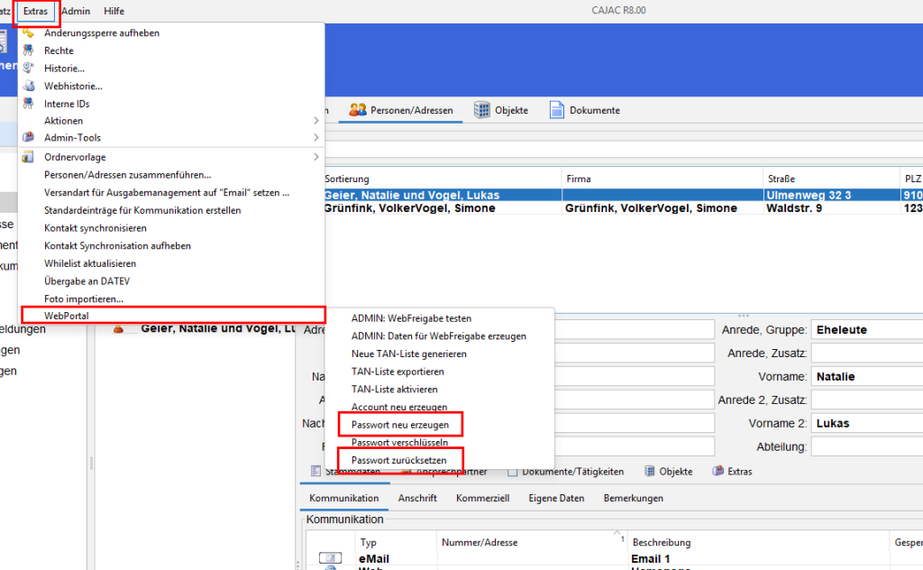 Gesuchte Adresse markieren und über Extras -> WebPortal das Passwort zurücksetzen oder neu erzeugen
