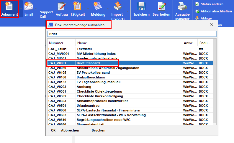 Zunächst wird über den Knopf ‚Dokument‘ ein Dokument aus den Dokumentvorlagen ausgewählt und angelegt: