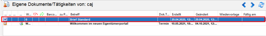 In der Aufgabenliste wird ein neuer Eintrag angezeigt mit dem Namen der Vorlage im Betreff: