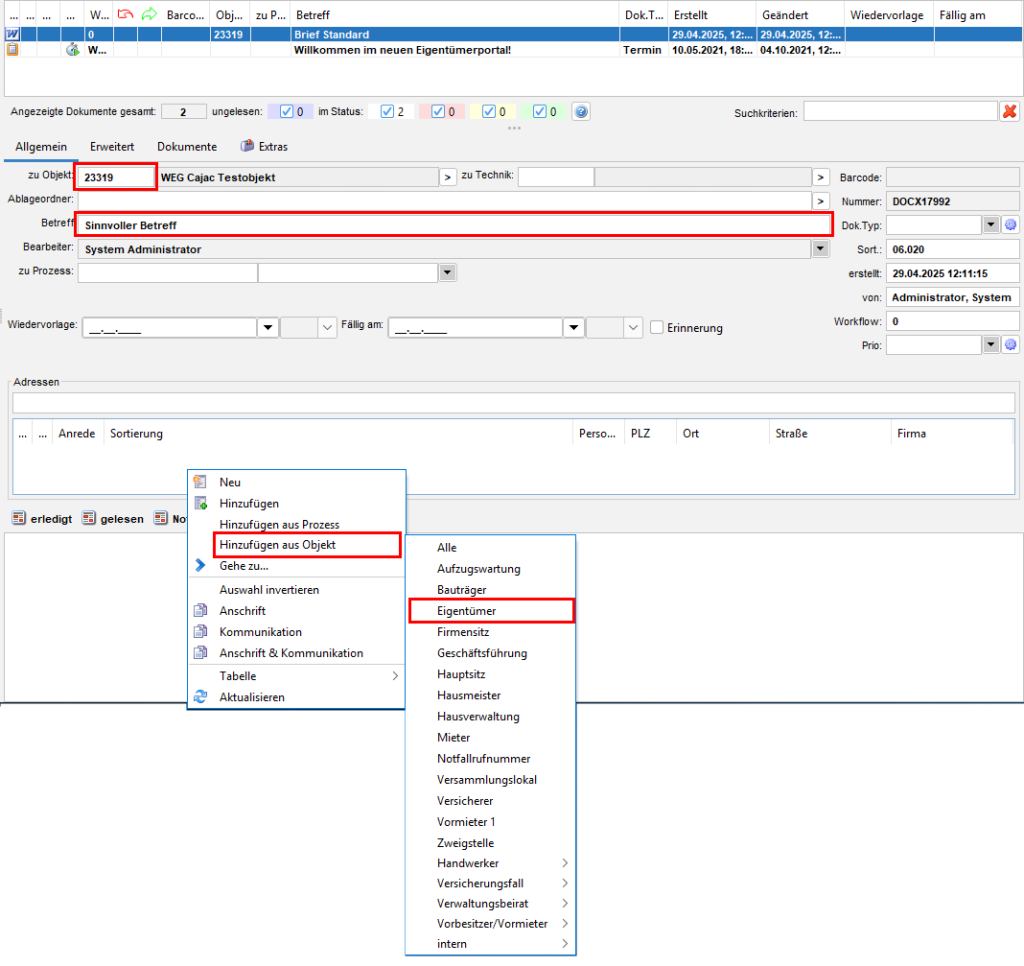 Im Detailbereich darunter werden nun die Meta-Daten wie Objektnummer, Betreff und Adresslisten hinzugefügt:
