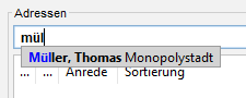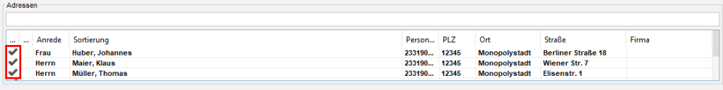 Bei Bestätigen durch ‚OK‘ werden die ausgewählten Adressen (kann auch nur eine Adresse sein) in die Liste der Adressen übernommen: