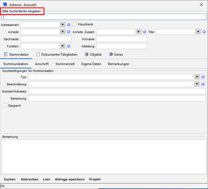 Man kann nach allen Feldern, die die Suchmaske bietet suchen, hier z.B. nach den Kommunikationsdaten (Telefonnummer, E-Mail-Adresse, etc.). Als Platzhalter oder Jokerzeichen wird das ‚%‘-Zeichen verwendet: z.B. %beispiel%@beispiel.de findet alle Adressen, die als E-Mail-Adresse vor dem @-Zeichen die Zeichenkette ‚beispiel‘ enthält.
