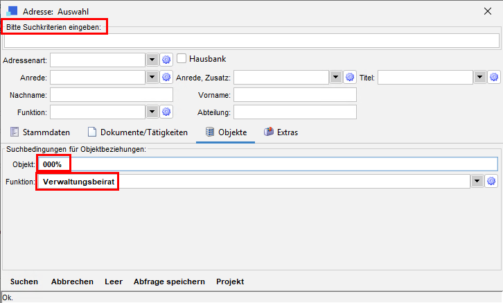 Sucht man die Verwaltungsbeiräte aller Objekte hat man die Möglichkeit über die Funktionszuordnung zu suchen:
