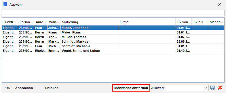 Im Suchergebnis können dann ggf. mehrfach gefundene Adressen (z.B. mit mehreren Einheiten) über den Knopf ‚Mehrfache entfernen‘ aus der Liste entfernt werden.