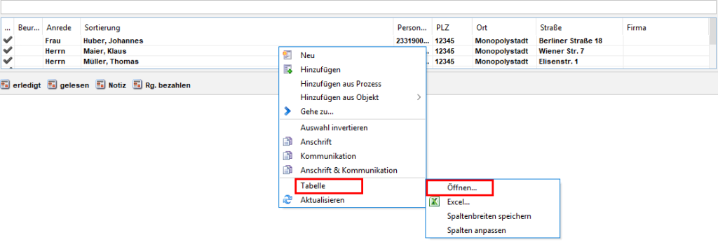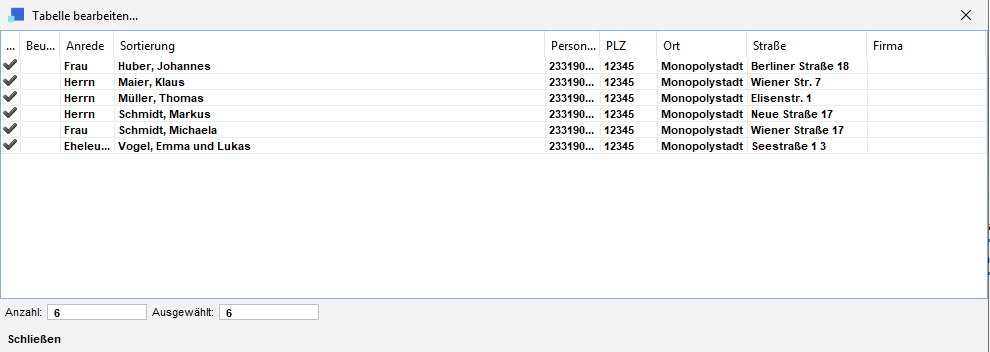 Über den Haken in der ersten Spalte wird gesteuert, welche Adressen später im Serienbrief berücksichtigt werden. Bei einer größeren Adress-Liste kann es sinnvoll sein, die Liste als Tabelle zu öffnen: