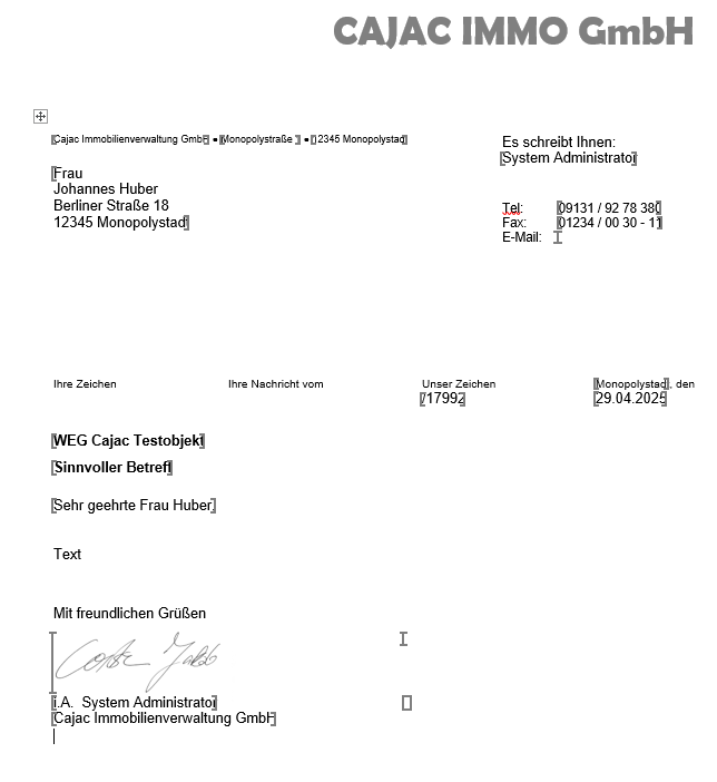 Es öffnet sich MS Word und die Vorlage mit den ausgefüllten Platzhaltern öffnet sich: