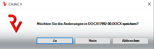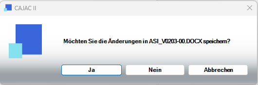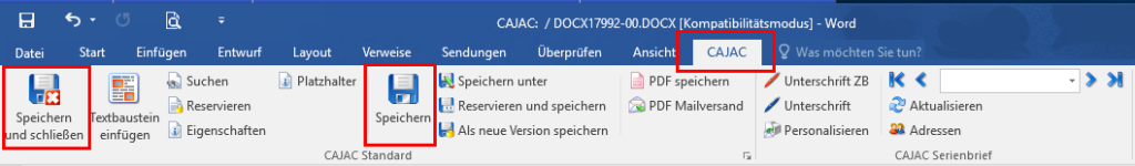 WICHTIG: DOKUMENT IMMER ÜBER DIESE SPEICHER-KNÖPFE SICHERN UND SCHLIEßEN. Andernfalls wird das Dokument NICHT in das CAJAC-Archiv zurück gesichert.
