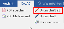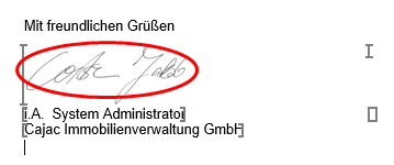 Für jeden Benutzer ist im Benutzerstamm eine digitale Unterschrift hinterlegt. Über die Funktionsknöpfe ‚Unterschrift ZB‘ bzw. ‚Unterschrift‘ wird diese Unterschrift in das Dokument auf die vordefinierte Stelle importiert: