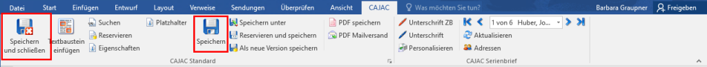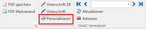 Personalisieren im Sinne von CAJAC bedeutet für jede zugeordnete und markierte Adresse wird ein separates PDF-Dokument generiert und ist damit der jeweiligen Adresse zugeordnet. Dafür steht in Word technisch das CAJAC Add-In cajmso zur Verfügung. Die Funktionen findet man in Word unter dem separaten CAJAC-Reiter: