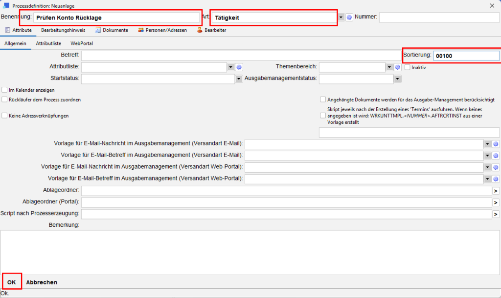 | Prozess ist ausführbar | Muss gesetzt sein, damit die Prozessvorlage zur Auswahl erscheint. | |