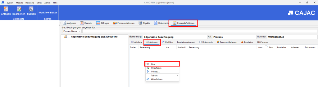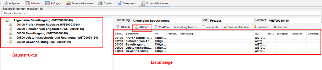 Nach Erfassen der Prozessvorlage können unter ‚Aktionen‘ die einzelnen Tätigkeiten erfasst werden. Soll es nur eine ‚einfache‘ Prozessvorlage ohne Workflow-Funktionalität werden, also lediglich eine Checkliste aller Tätigkeiten, dann können diese unter dem Reiter ‚Aktionen‘ erfasst werden:
