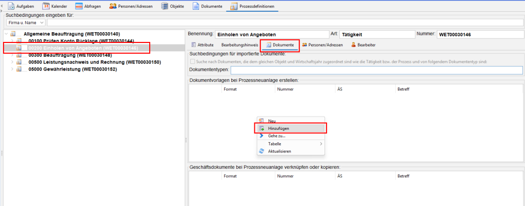 Um Dokumentvorlagen in Prozess- oder Tätigkeitsvorlagen einzufügen, sollte man die Dokumentvorlagen bereits vorher angelegt haben. Zwar ist auch ein Neuanlegen auch an dieser Stelle möglich, aber nicht empfehlenswert. Informationen zum Anlegen von Dokumentvorlagen finden Sie hier.