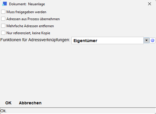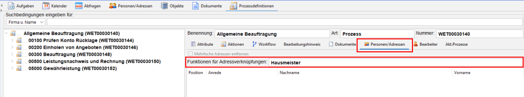 | Funktionen für Adressverknüpfungen | Alle Adressen des Objekts mit der angegebenen Funktionen werden ermittelt und dem Prozess/der Tätigkeit zugeordnet. |