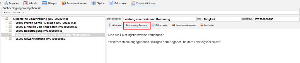 Unter Bearbeitungshinweise können Sie Anweisungen für den Mitarbeiter erfassen, die dann bei der Prozessbearbeitung zur Verfügung stehen:
