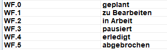 | Startstatus | In der Prozessbearbeitung kann über den Startstatus der jeweilige Zustand des Prozesses oder der Tätigkeit verwaltet werden. Der Startstatus definiert den Status, in dem der Prozess angelegt wird. (mögliche Status siehe unten) Wird hier kein Status ausgewählt, wird der Prozess generell im Status WF.2 (in Arbeit) angelegt. In dem Beispiel ist der Status WF.1 für ‚zu Bearbeiten‘ konfiguriert (optional) | WF.1 (zu Bearbeiten) |