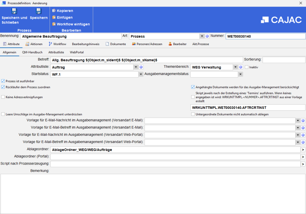 | Attributliste | Klassifizierung der Prozessvorlage. CAJAC bietet bereits eine Sammlung von Klassifizierung an, diese können über die Attributlistenverwaltung jederzeit erweitert werden. Die bereits bestehenden Klassifizierungen besitzen i.d.R. ein eigenes Icon und teilweise weitere Attributfelder. (optional) | Auftrag |