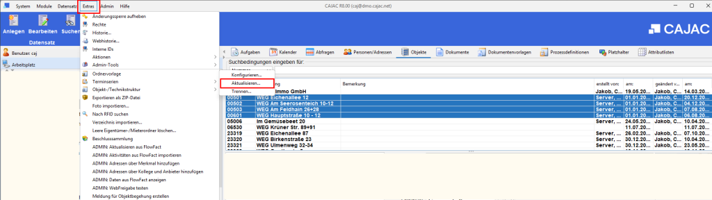 Anstoß der Aktualisierung bei einem ausgewählten Objekt: