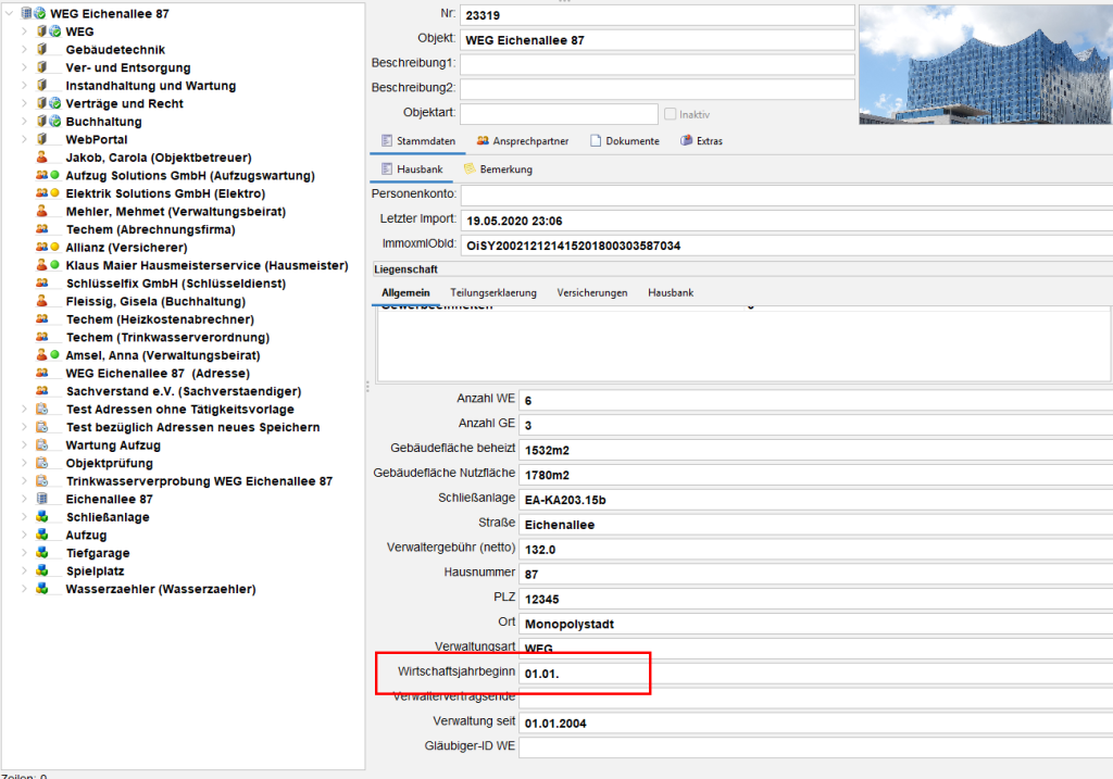 Beachten Sie: Bei neuen Objekten muss zunächst das Feld ‚Wirtschaftsjahrbeginn‘ gepflegt werden (in der Regel 01.01. ausser bei abweichenden Wirtschaftszeiträumen) und anschließend eine Ordnervorlage auf das Objekt konfiguriert werden: