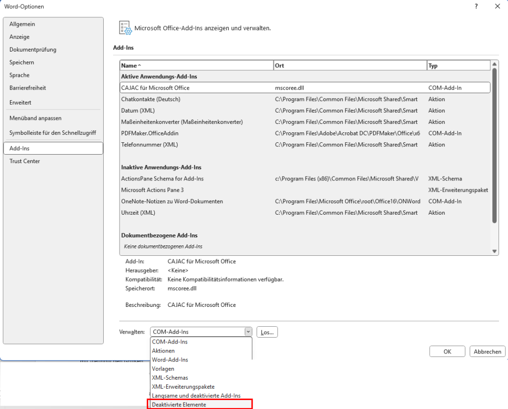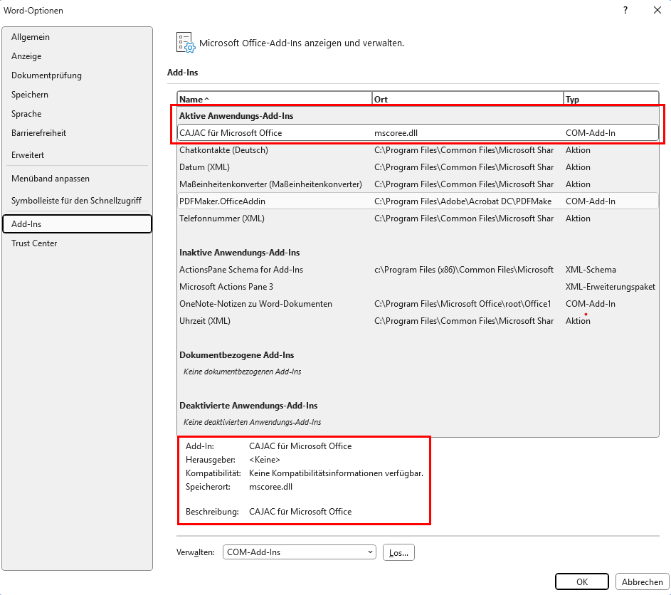 Wahrscheinlich ist die CAJAC Officeschnittstelle nun nicht bei den aktiven Add-Ins aufgelistet, sondern bei den Deaktivierten Add-Ins: