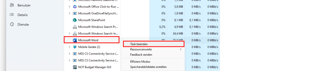 Problembehebung: Über den Taskmanager prüfen Sie, ob ein Word-Prozess läuft, obwohl Word als Programm nicht geöffnet ist, also in der Tastleiste kein offenes Worddokument angezeigt wird.