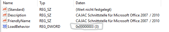 Hier muss das LoadBehavior auf ‚3‘ stehen. Falls nicht, mit Doppelklick oder rechter Maustaste -> Ändern eine ‚3‘ eintragen..