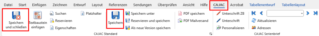 Sind alle Eingaben in Word getätigt MUSS das Word-Dokument über die speziellen CAJAC-Speicher-Knöpfe gespeichert werden: